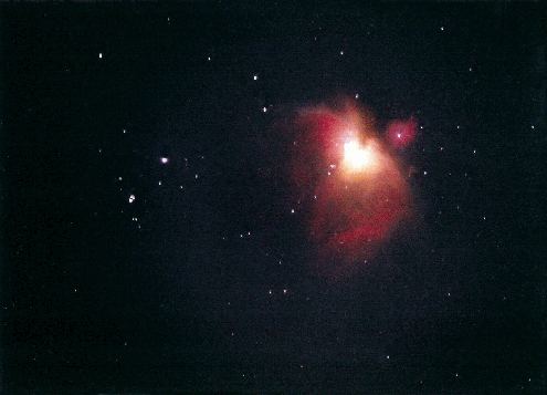 Photo of the Orion nebula by Professor M. R. Franks. Taken on 27 January 2004 from Professor Franks's front yard in Baton Rouge, Louisiana. Shot at prime focus with a conventional Ricoh 35 mm camera using as its lens a six-inch (diameter) Celestron refractor telescope on a computer-driven German equatorial mount. Focal length 1,200 mm (47.24 inches); effective focal ratio f/7.87. Exposure on Agfa ISO 800 film for 10 minutes, using an LPR (light pollution reduction) filter.